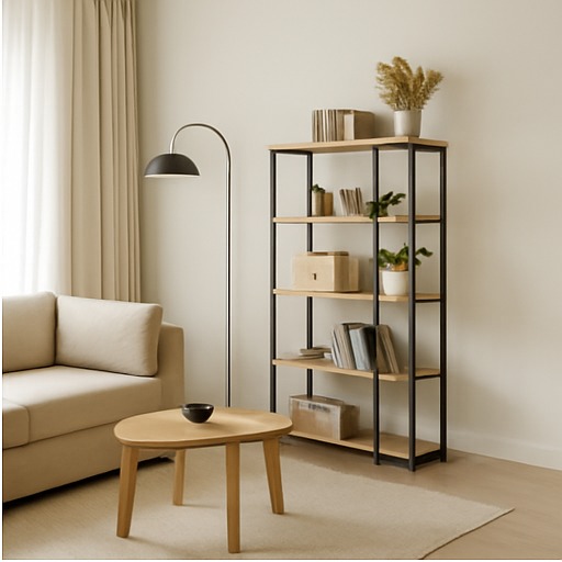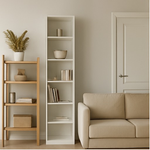Floor space is precious, so look up. Tall bookshelves, wall-mounted cabinets, and hanging racks keep essentials organized without consuming valuable square meters.